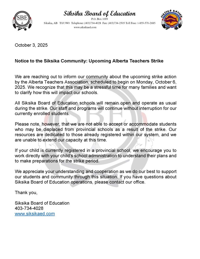 Please review the notice below regarding the upcoming Alberta Teachers’ Strike. A reminder that Siksika schools are not affected by the strike and will remain in operation during this time.